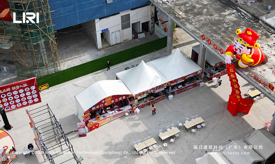 Atmospheric Lighting: The white PVC fabric acts as a soft-box during the day and a glowing beacon at night. Combined with traditional lanterns and integrated LED tracks, it creates an immersive atmosphere that drives foot traffic.