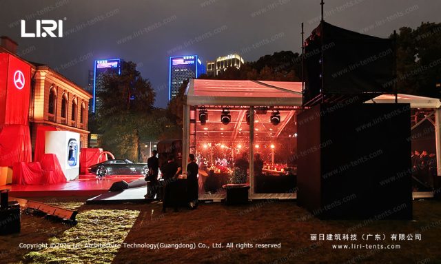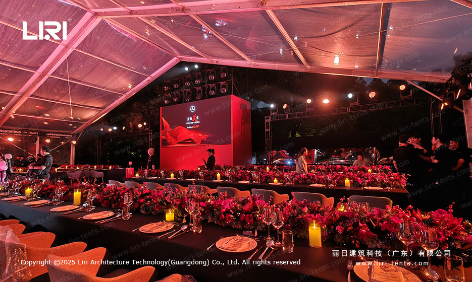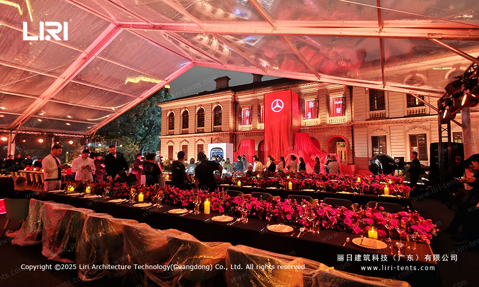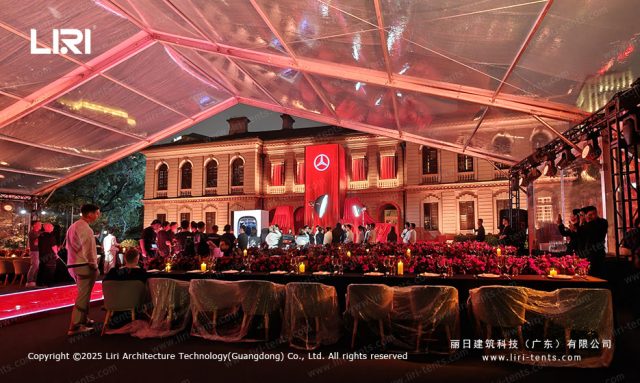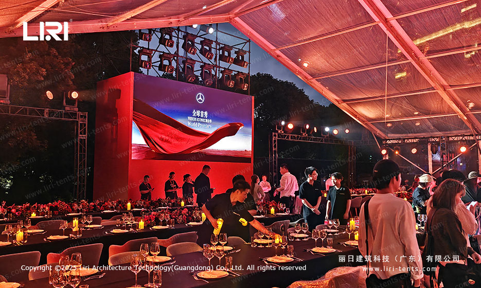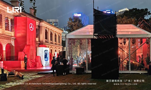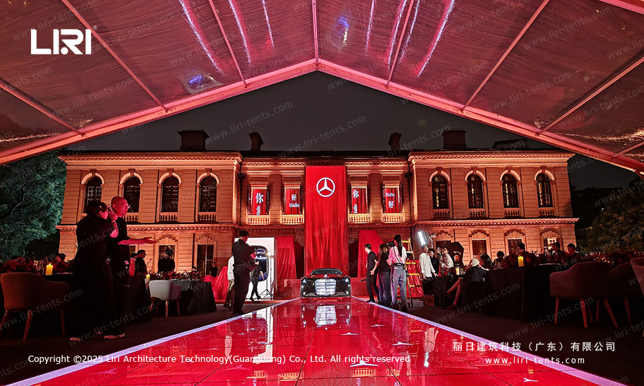 Immersive Brand Interaction As seen in the Mercedes-Benz setup, the transparency allows for a cross-temporal dialogue between the new vehicle and the classic architecture in the background. This level of prestige is something a permanent indoor ballroom simply cannot replicate.