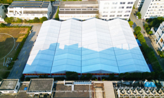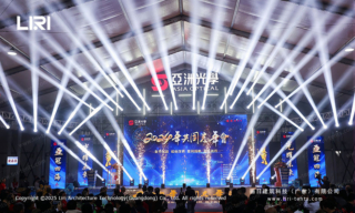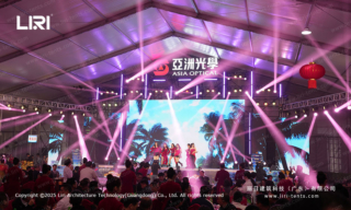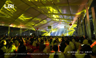Inside the tent, there are no annoying poles, so you can arrange the space however you want. The stage, seats, and activity areas can be set up just the way you like. From the outside, the tent looks great too. The white cover shines in the sunlight during the day, and at night, with the lights on, it becomes a beautiful party venue.