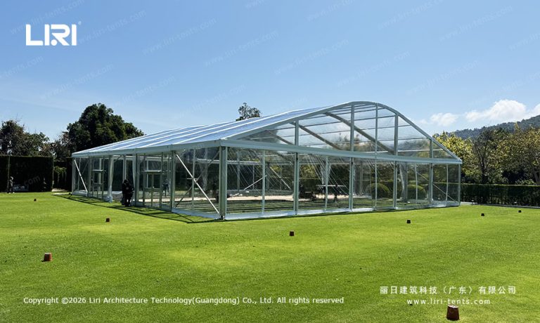The main profile size of the 10×30 party tents is 100X48X3mm. According to your requirements, we can increase or decrease the modular structure in the bay distance of 5m. We manufacture the main frameworks (upright support and roof beam) with high impact extruded anodized aluminum (6061/T6). The PVC covers use PVC-coated polyester textile, which is flame retardant. And the optional colors include white, red, yellow, blue, green, black, grey, transparent, etc.